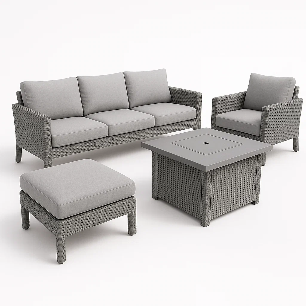 Este conjunto de muebles de exterior está diseñado en ratán sintético con una estructura interna de aluminio. Los cojines están elaborados en poliéster, brindando una construcción robusta y duradera.